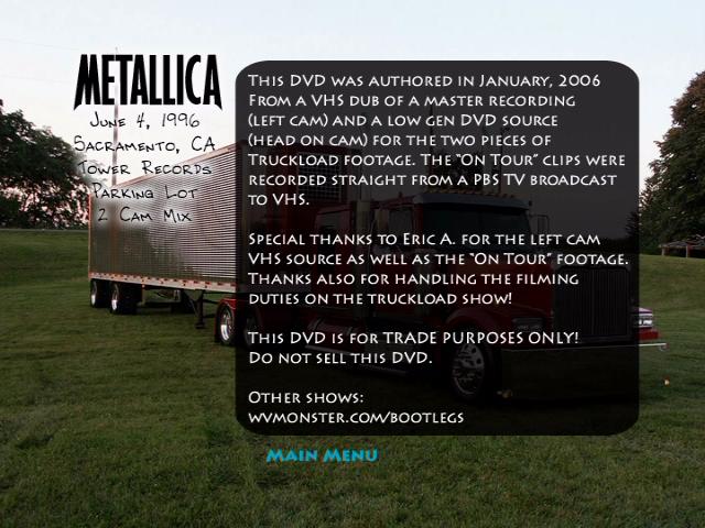 This show is a combination of two sources for the June 4th, 1996 Truckload show in Sacramento, CA. The first source is the "upgrade" version of this show, which is shot using a straight on angle of the stage. Generation on this source is low (2nd gen?). The other source is shot from the left side of the stage, right up front.